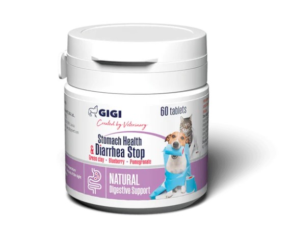 For cats and dogs A completely natural solution to soothe the digestive tract and treat diarrhea in your dog or cat WHEN TO USE Use Stomach Health and Diarrhea Stop for cats and dogs in case of irritable digestive tract and diarrhea. Stomach Health and Diarrhea Stop absorbs toxins and other harmful substances in the digestive tract, stabilizes the digestive tract without affecting enzymes. SUITABLE FOR For cats and dogs of all sizes and ages for the treatment of diarrhea. Also recommended for bitches who have just given birth to prevent "postpartum diarrhea". best natural diarrhea remedy for cats and dogs Gentle and effective normalizes the functions of your pet's digestive tract and improves well-being. BENEFITS GIGI VET functional food Stomach Health and Diarrhea Stop tablets have a unique manufacturing solution. It contains high-quality natural ingredients that: Stops diarrhea Normalizes the digestive tract Absorbs toxins without affecting enzymes Safe for bitches who have just given birth and their puppies Has a strong antioxidant effect Stomach Health and Diarrhea Stop is safe for pets of all ages, as it does not contain antibiotics or hormones! Pharmacological properties and active ingredients of the natural cat and dog laxative Stomach Health and Diarrhea Stop: French green clay contains magnesium, calcium, manganese, phosphorus, zinc, aluminum, quartz, copper, selenium and cobalt. It adsorbs toxins in the digestive tract (aflatoxins, mycotoxins, toxins produced by pathogenic bacteria) and other substances harmful to the body. It stabilizes the functioning of the digestive tract without affecting its fermentation processes; adsorbs water, prevents dehydration of the body, regulates the consistency of intestinal contents, prevents the loss of cations necessary for metabolism (Na +, K +, Mg2 +, Ca2 +, etc.). Blueberry extract contains - vitamins C, B1, D2; trace elements - potassium, calcium, magnesium, iron; anthocyanidins (up to 25%); sugar and fruit acids - citric acid, malic acid, lactic acid, oxalic acid, succinic acid, quinic acid, astringents, tannins, etc. Bioflavonoids stabilize the functioning of the digestive tract, have anti-inflammatory and antimicrobial effects, have an astringent effect and soothe irritated digestive tract. Blueberries have a strong antioxidant effect, which prevents the degradation of cell phospholipid membranes. Bioflavonoids protect the cell membranes of blood vessels and capillaries, improve microcirculation, riboflavin affects all types of metabolism, flavonoids protect the gastric mucosa and promote mucus secretion. Pomegranate extract contains - vitamins (B1, B2, B3, B6, B9, C) and minerals (calcium, iron, manganese, phosphorus, potassium, zinc), as well as hydrolyzed tannins (punicalagins). Pomegranate extract contains alkaloids and polyphenols. Hydrolyzed tannins have an astringent effect on the digestive tract, reducing inflammation of the mucous membrane. Pomegranate extract has antimicrobial effects, especially against Escherichia coli, Enterococcus faecalis, Enterobacter aerogenes and gram-positive staphylococci. DOSAGE RECOMMENDATION Stomach Health and Diarrhea Stop use: Small breeds of dogs and cats: 1 tablet per 2 kg 3 times a day.